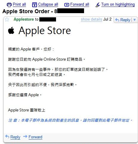 iPod Touch出貨異常通知(在iPod Touch運送時出了一點意外,在浦東機場被扣留了一段時間,寄email通知)